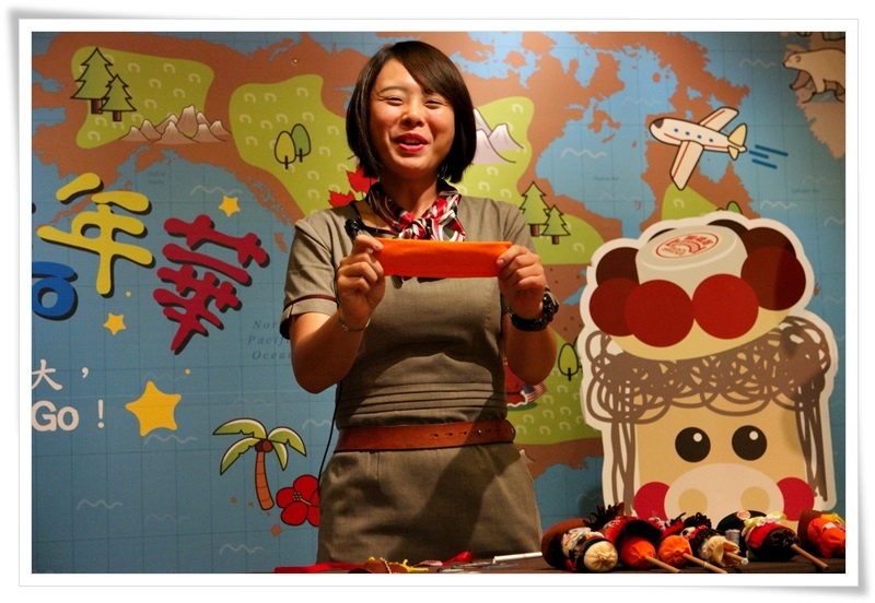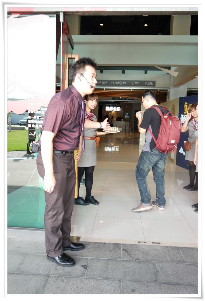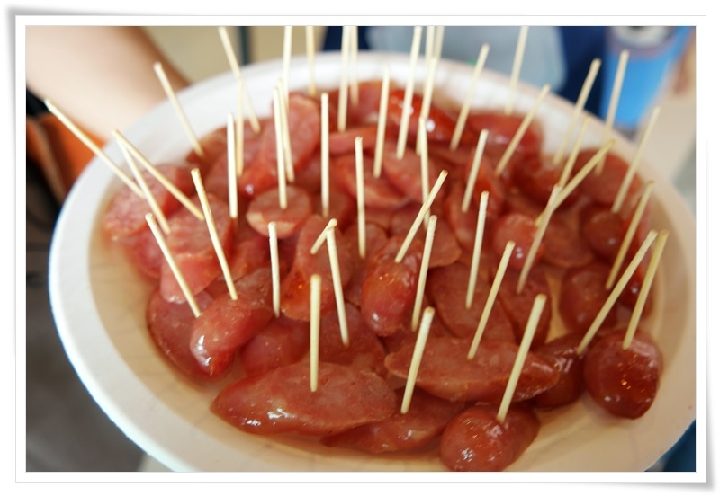 服務人員端出香腸給大家試吃。